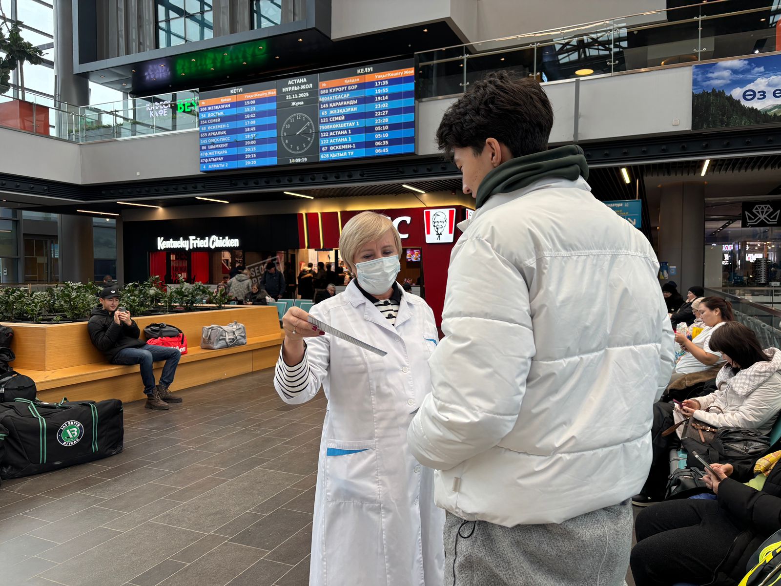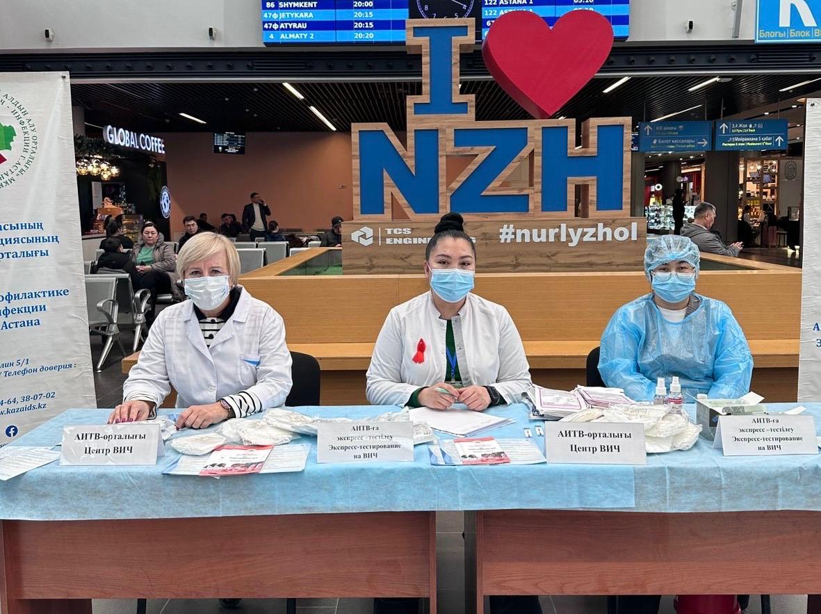 Дүниежүзілік ЖИТС-пен күрес күніне арналған науқан аясында 2024 жылғы 21 қарашада қалалық АИТВ инфекциясы орталығының мамандары «Нұрлы жол» теміржол вокзалында Астана тұрғындары мен қонақтары үшін «АИТВ-ға қарсы күрестегі қиындықтардан - тиімді өзгерістерге» ауқымды акциясын өткізді.